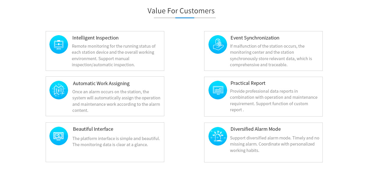 Automatic Work Assigning Once an alarm occurs on the station, the system will automatically assign the operation and maintenance work according to the alarm content. |